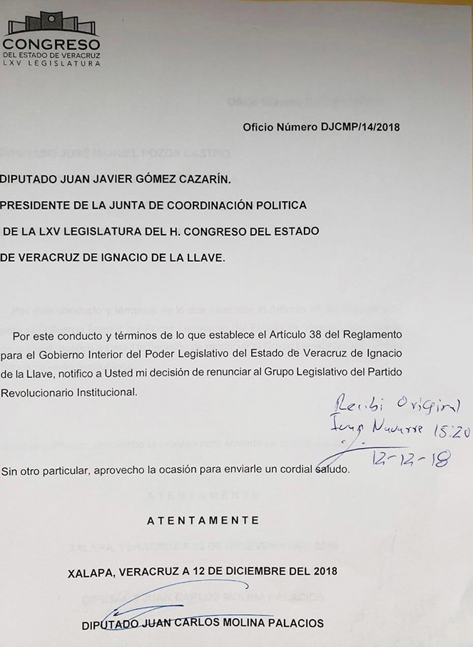 Juan Carlos Molina renuncia a la minibancada priista en el Congreso local