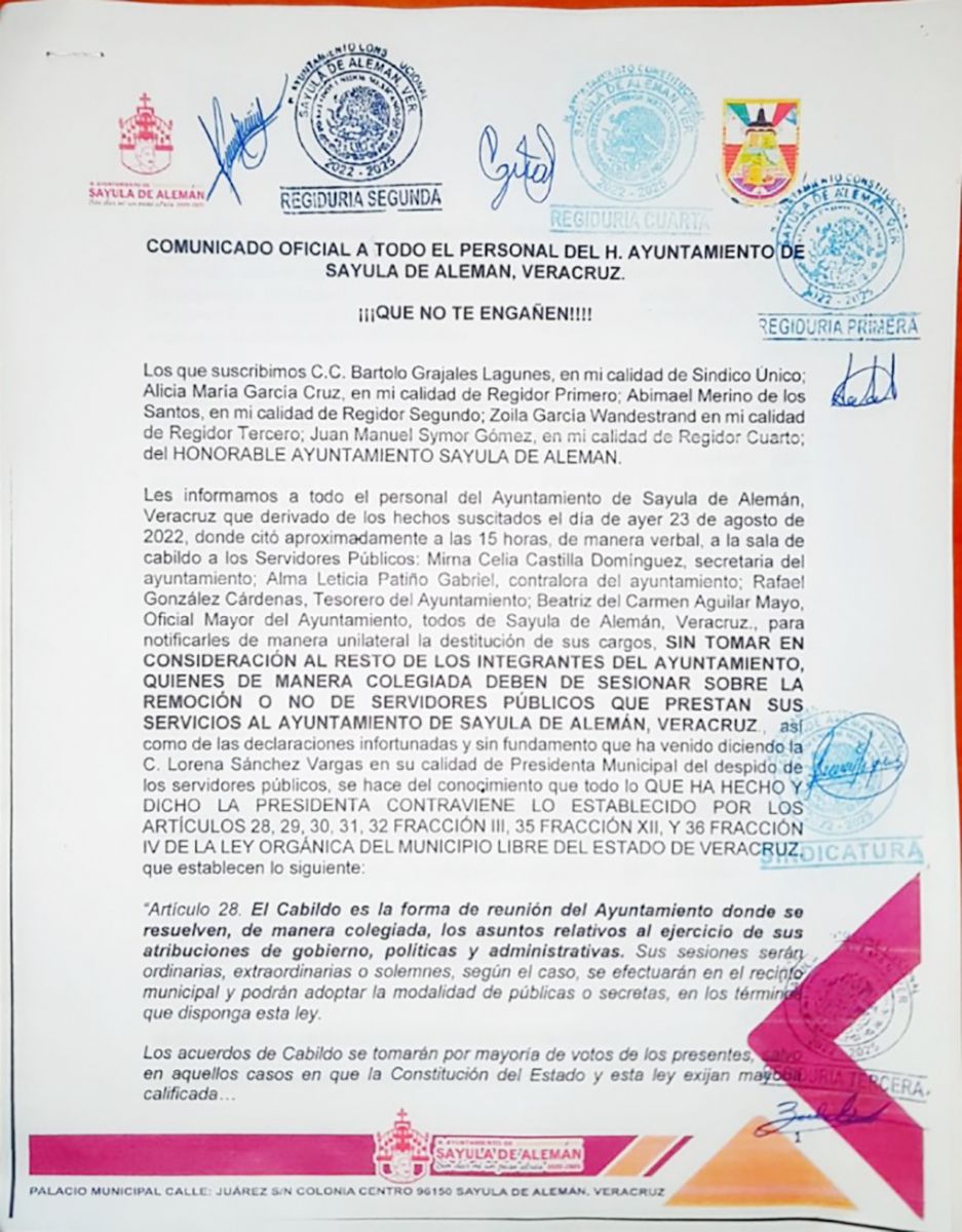 Alcaldesa de Sayula de Alemán destituye a cuatro funcionarios municipales