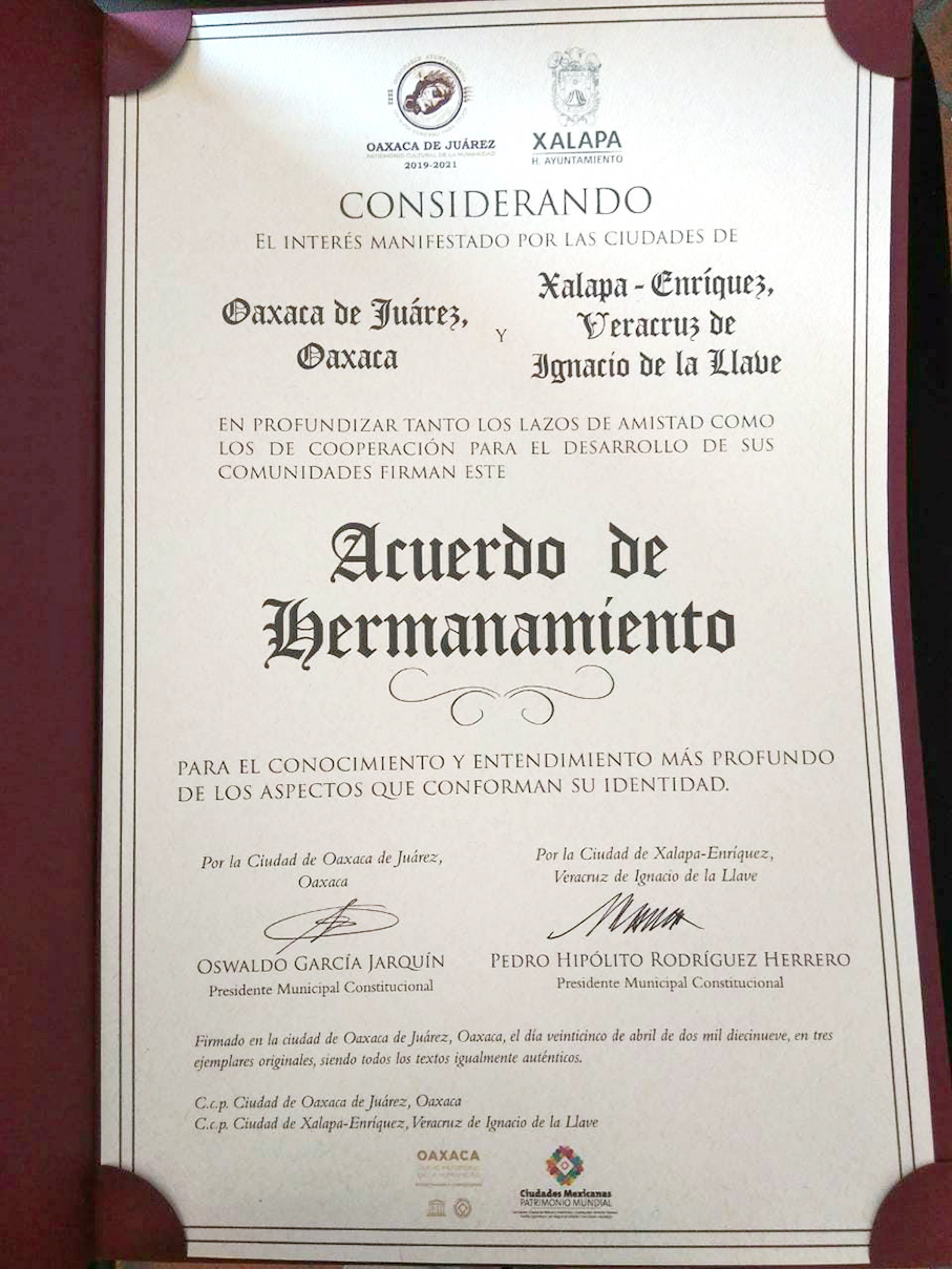 Xalapa y Oaxaca de Juárez tienen mucho en común: arte, cultura, tradiciones y patrimonio histórico; el hermanamiento entre estas ciudades permitirá emprender acciones concretas que mejoren ambas economías y contribuyan a que haya más seguridad, estabilidad, acompañamiento y desarrollo, afirmó el presidente municipal Hipólito Rodríguez Herrero.