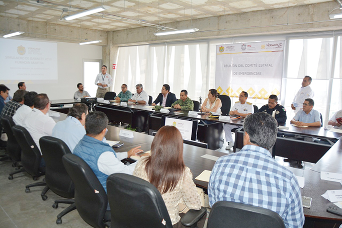 Xalapa, Ver., 19 de junio de 2019.- Con el fin de coordinar acciones preventivas para la atención de emergencias, la Secretaría de Protección Civil (PC) coordinó junto con el Comité Estatal de Emergencias (CEE) un simulacro de gabinete por la llegada de un huracán a costas veracruzanas.