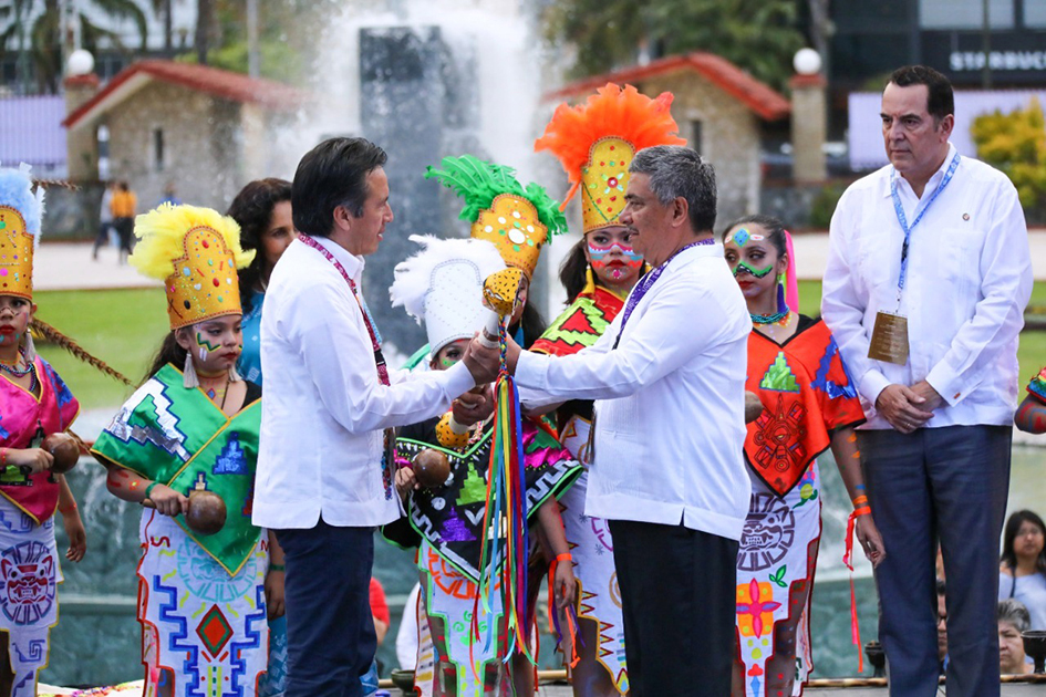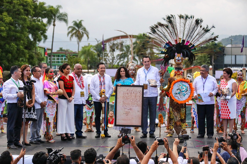 Acompañado de 60 alcaldes, servidores públicos estatales, diputados locales y la presidenta de la Comisión de Cultura del Senado de la República, Susana Harp, y tras la Danza del Tigre ejecutada por el ballet folklórico de Teocelo, el Gobernador recibió el bastón de mando de manos del alcalde de dicho municipio, Mario Antonio Chama Díaz.