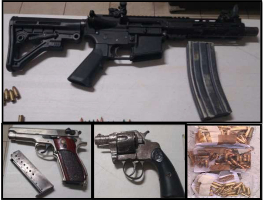 Les incautaron 33 dosis de marihuana, 39 de cristal, 5.2 kg de marihuana, 4 mil 365 pastillas de metilfenidato, un fusil M4 calibre .223, un revólver Colt calibre 38 especial, una pistola Smith & Wesson 9 mm, 138 cartuchos últiles y dos cadenas “ponchallantas”. También un Honda Civic, placas GZU321C de Guerrero, un Chevrolet Chevy, láminas YJV7386 de Veracruz, y una motocicleta Italika 150, sin placas.